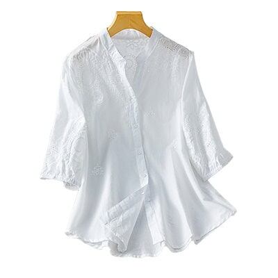 今っぽシアーシャツ 長袖 韓国 Vネック刺繍透かし彫りアンズ色シャツ女七分袖夏の新しい通勤気質コットントップス ブラウス レディースファッション オフィス カーディガン