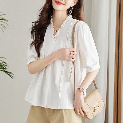 今っぽシアーシャツ 木耳辺v襟白シャツ半袖女性2024夏新作ゆったり綿の上着シャツ 韓国 ブラウス レディースファッション オフィス カーディガン