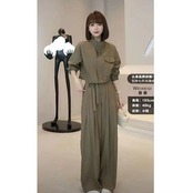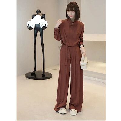 涼しく楽ちんセットアップ 2024新作気品スーツ長袖トップスにワイドパンツの2点セット レディース 韓国ファッション