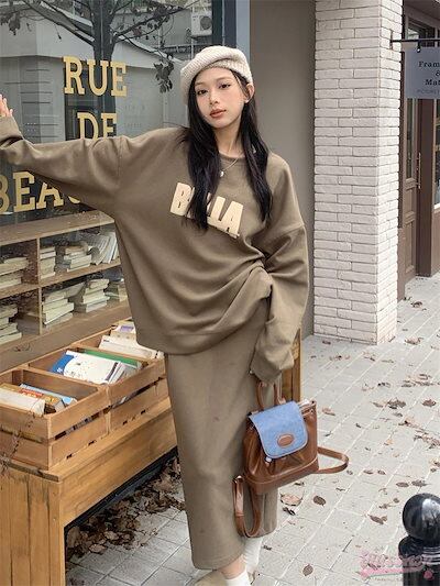 上下別売り 薄手 長袖シャツ トップスロングスカート 丈長め ルーズ レディース かわいいシルエット2点セット フード付き風 きれいめ サイズ 秋冬 ゆったり通勤 通学ファッションブル大人可愛い