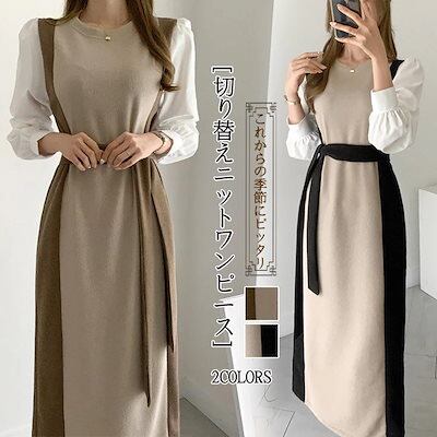 2024新作 おしゃれ 気質 ワンピース 丸ネック 長袖 ニットワンピース 通勤 ロングワンピース 切り替え シャツワンピース