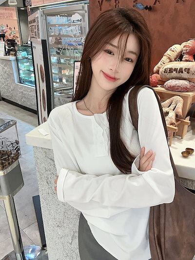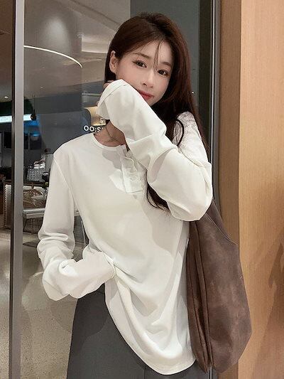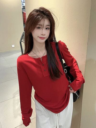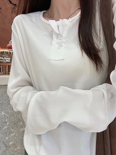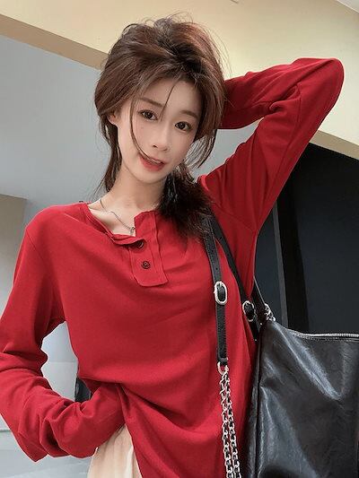 2024春夏トップス Tシャツ 長袖 ラウンドネック ボタン 薄手 ゆったり 細見え 夏 白 赤 おしゃれ かわいい 韓国ファッション レディース お出かけ