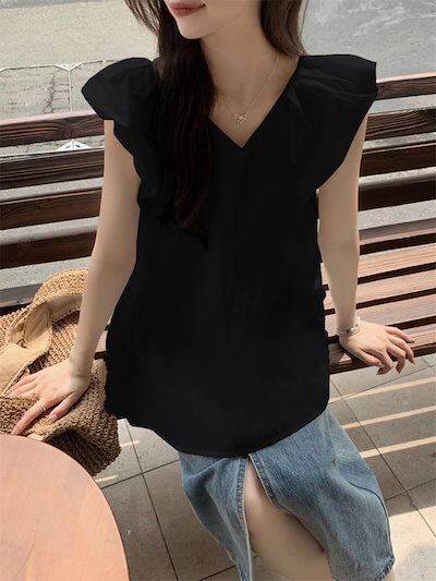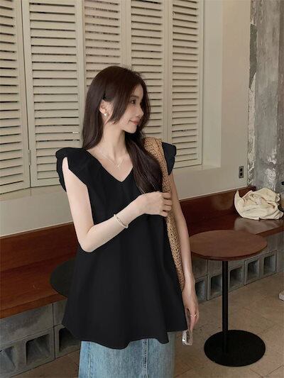 2024夏トップス シャツ リボン 半袖 Vネック 丈長め ゆったり 細見え 夏 白 黒 おしゃれ かわいい ガーリー キュート 甘め 韓国ファッション レディース お出かけ