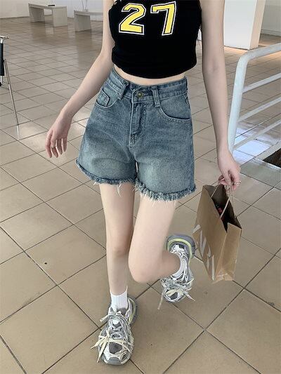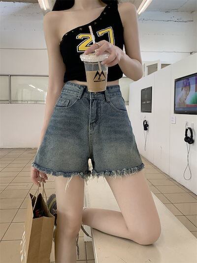 2024 春夏パンツ デニム ジーンズ ショート丈 フリンジ ハイウエスト 美脚効果 脚長効果 細見え 夏 おしゃれ かわいい 韓国ファッション レディース お出かけ