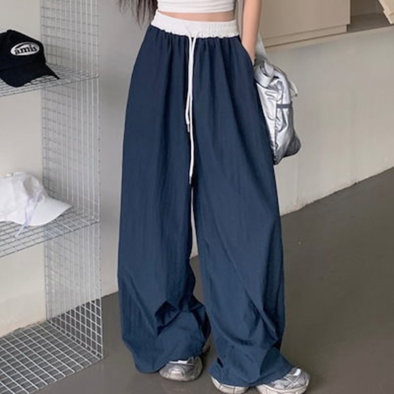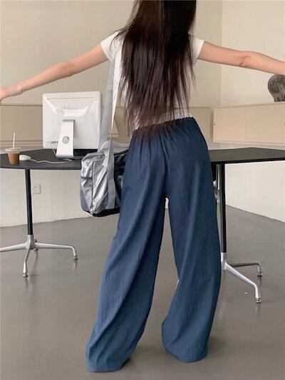 2024 春夏パンツ モップパンツ ロング丈 ワイド ハイウエスト 美脚効果 脚長効果 細見え 夏 青 黒 おしゃれ かわいい 韓国ファッション レディース お出かけ