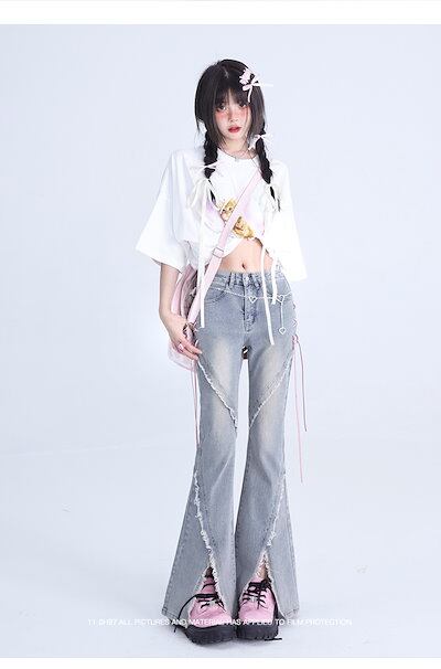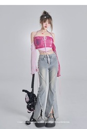 2024夏 韓国 デニムパンツ ボトムス ジーンズ ハイウエスト ファッション系ワイド スタイルサイド紐が付い ゆるダボ ジーンズ シルエット加工 レディース カジュアル メンズライク