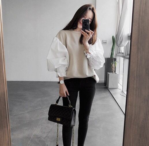レディーストップスセーターニットラウンドネックパフスリーブ切替無地長袖大きいサイズゆったり大人カジュ
