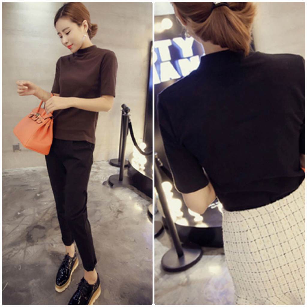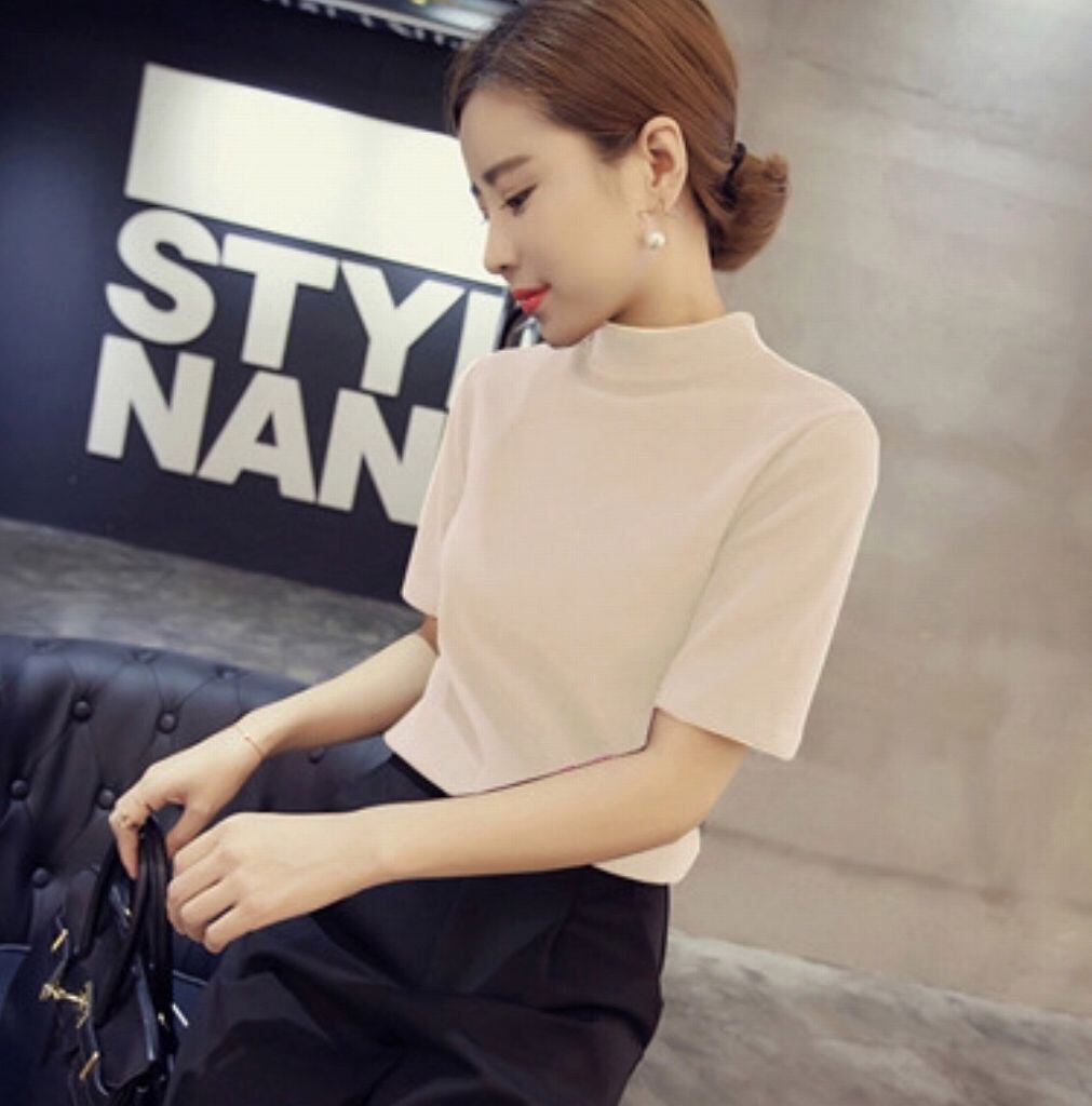レディーストップス5分袖カットソーニットサマーセーター無地ハイネックカジュアルキュート大人可愛いベー