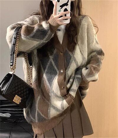 ボタン留め vネック 羽織 カーディガン ダイヤ柄 パーカー カーデ アウター ゆったり カジュアル 暖かい 上着 秋物 コート 長袖 体型カバー 羽織り レディース ニットアウター セーター 秋 オ