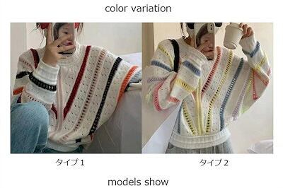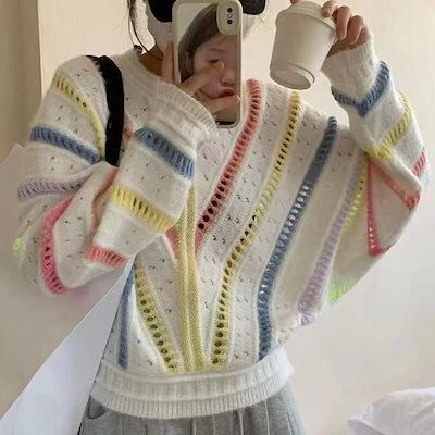 きれいめ 透け感 春秋 デザイン 長袖 ニット ニットトップス ゆったり 体型カバー ブラウス 秋服 レディース カットソー 秋 トップス カジュアル ニットセーター 配色 プルオーバー セーター
