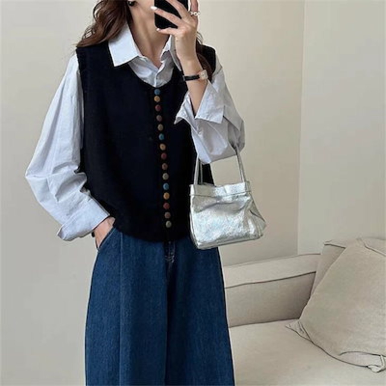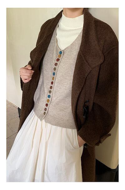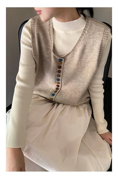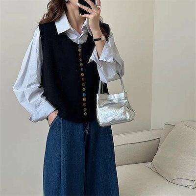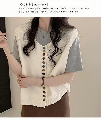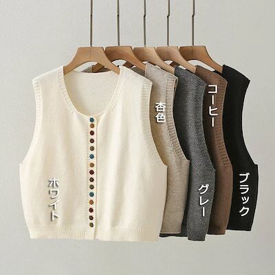 Uネック レイヤード 重ね着 防寒 無地 トップス リブニット 保温 ニットベスト ボタン ブラウス ノースリーブ ニットセーター ボタン飾り リブ 黒 ショート丈 可愛い 秋冬 プルオーバー レディ
