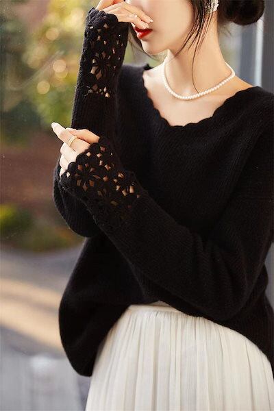レディース エレガント プルオーバー 花柄 長袖 ニットソー 柔らかい ブラウス ニット ニットセーター 刺繍 防寒ニット 無地 ニットソー 伸縮性 リブニット 透かし彫り 黒 綺麗め ショート丈 杏