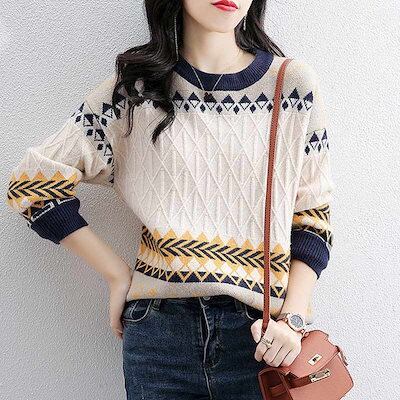 もこもこ 秋冬 レディース きれいめ カジュアル 冬 トップス おしゃれ 通勤 セーター クルーネック コーデ プルオーバー 柔らかい 長袖 ブラウス シンプル リブ編み ニットトップス ゆったり 柄