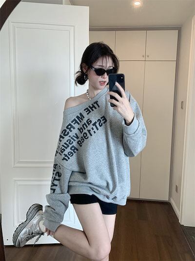 2024秋冬トップス 長袖 肌見せ 英語 プリント ゆったり 細見え 秋冬 グレー おしゃれ かわいい 韓国系ファッション レディース お出かけ