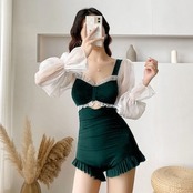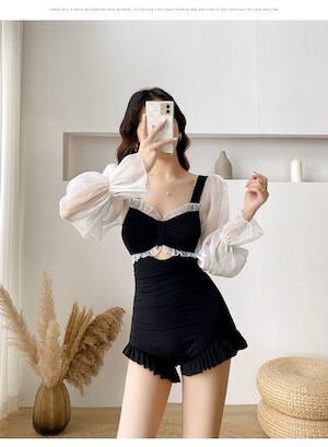 2色 水着 リボン モノキニ 透け感 キュート 華やか ラブリー ミニ ショート丈 フリル 可愛い 体形カバー ワンピース 大人 お姉さん スタイルアップ モテ レディース ブラック グリーン ブルー