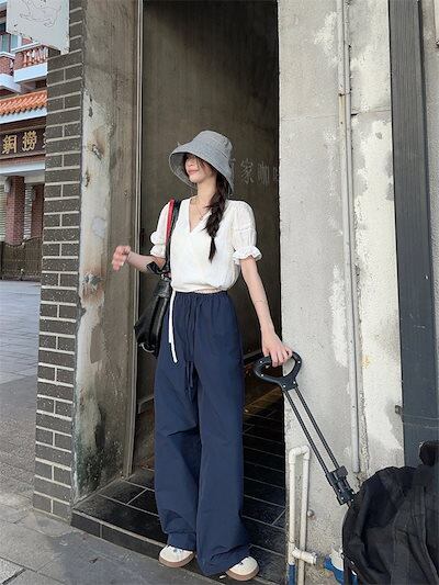 2024 春夏パンツ モップパンツ ロング丈 ワイド ウエストゴム ハイウエスト 美脚効果 脚長効果 細見え 夏 青 ブルー おしゃれ かわいい 韓国ファッション レディース お出かけ