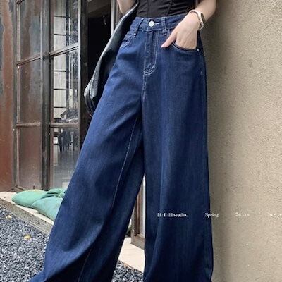 2024夏パンツ デニム ジーンズ ロング丈 ワイドレッグ ハイウエスト 美脚効果 脚長効果 細見え 夏 青 おしゃれ かわいい 韓国ファッション レディース お出かけ