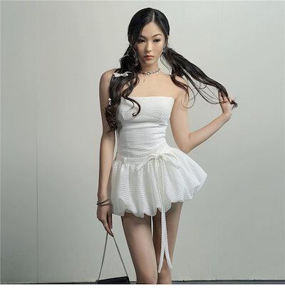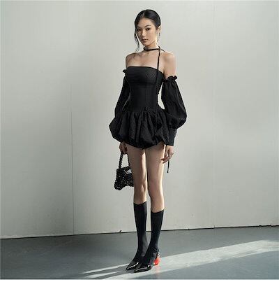 2024 春夏 ミニワンピ シアースリーブ 大人可愛い キュート 肌見せ カジュアル フェミニンセクシーピュアシフォン フェミニンタイト白黒青韓国系 ファッションデートフレンチaラインチュニック秋
