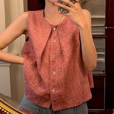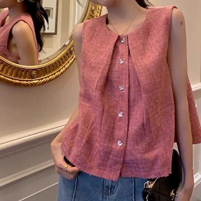 2024 夏 韓国トップス シャツ ラウンドネック ボタン ノースリーブ ゆったり 細見え 夏 ピンク おしゃれ かわいい 大人っぽい きれいめ 韓国ファッション レディース お出かけ