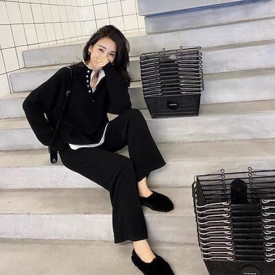新作 おしゃれ シンプル レディースセットアップ セーター ワイドパンツ 二点セット 気質 セット ニットセットアップ