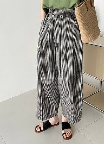 ワイドパンツ レディース アンクル丈 ギンガムチェック柄 イージーパンツ 綿麻風 パンツ ボトムス 大人カジュアル ナチュラル 森ガール ズボンバギー ウエストゴム 大きいサイズ ゆったり 体型カバー