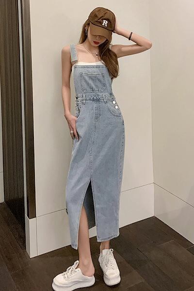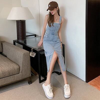 ひんやりボトムスデニムサロペットスカート デニム ゆったり ワンピース スリット ワンヒース レディース パーティードレス ロングワンピース 韓国 ワンピースセット ワイドパンツ