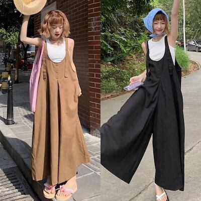 サロペット 夏 ゆったりカジュアル 怠惰な風 オールインワン オーバーオール 百掛け ロング ワイドパンツ レディース 体型カバー?ひんやりボトムス 学生 20代30代40代