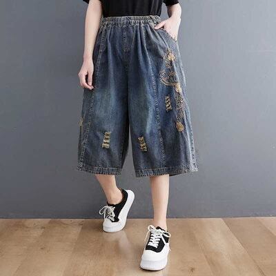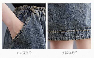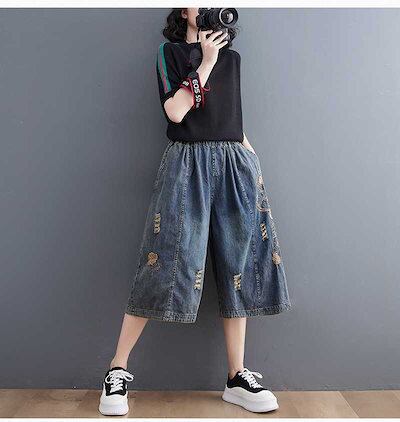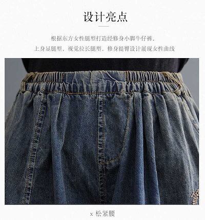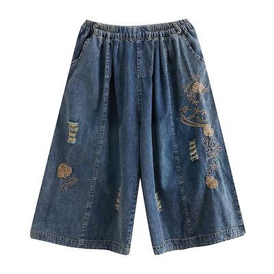 「ファットガール」 2024夏新品 七分丈 ワイドパンツ デニムパンツ ゴム 刺繍 大きいサイズ 体型カバー レディース パンツ メガ割