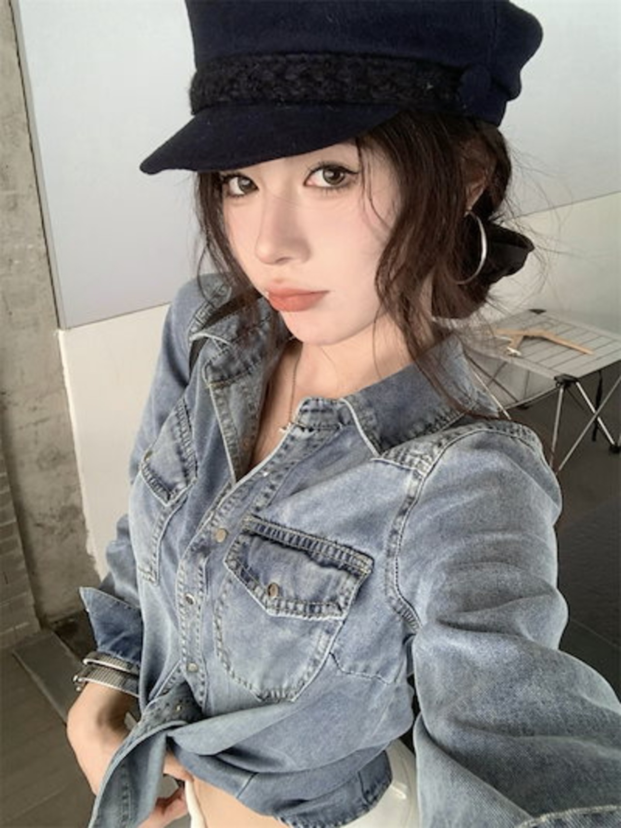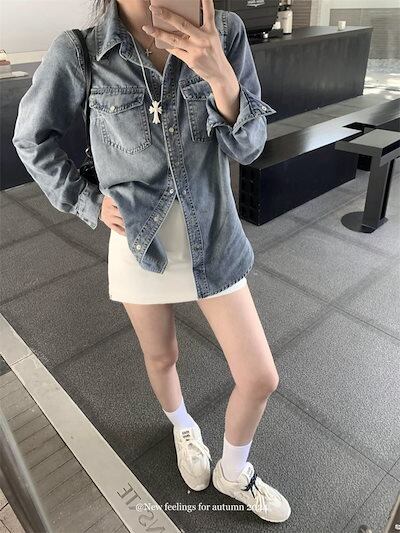 2024秋冬トップス シャツ デニム生地 ポケット 襟 スタンダードカラー ボタン 長袖 秋 青 ブルー おしゃれ かわいい 韓国ファッション レディース お出かけ