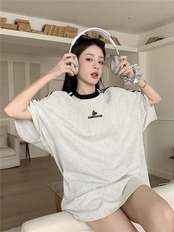 2024夏 韓国可愛い風トップス Tシャツ ロング丈 ファッション 半袖スリムフィット サイド ペイントシルエット ゆったり 休日レディースサイズ韓国系ネック_おしゃれ カジュアル メンズライク T