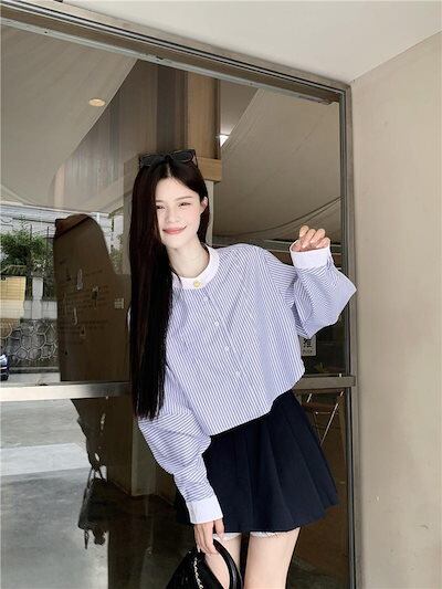 2024秋冬トップス シャツ 長袖 ストライプ ボタン 襟 スタンダードカラー 秋 青 ブルー おしゃれ かわいい 韓国ファッション レディース お出かけ