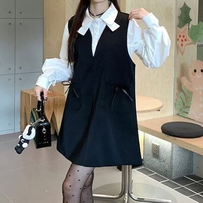 2024秋冬2点セット ワンピース ミニ丈 ジャンパースカート ジャンスカ Vネック リボン トップス シャツ 長袖 秋 白 黒 おしゃれ かわいい 韓国ファッション レディース お出かけ