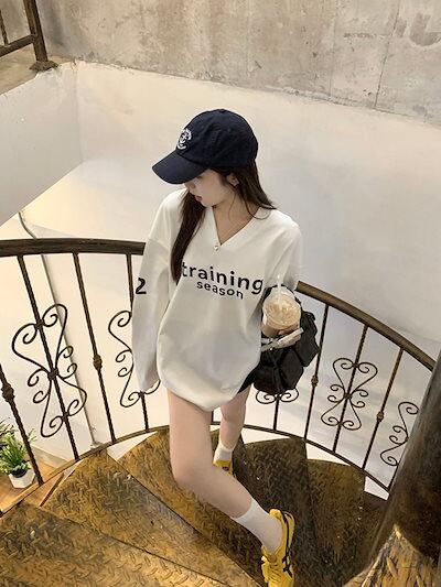 2024 秋冬トップス スウェット 長袖 Vネック 英語 数字 23 ゆったり 秋 白 おしゃれ かわいい 韓国ファッション レディース お出かけ