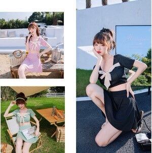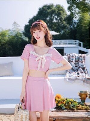 2024 3色 半袖水着 タンキニ 2点セット ツーピース リボン フリル 着痩せ ガーリー プリティ キュート レトロ スリム ミニ ショート丈 可愛い 大人 お姉さん イイ女 スタイルアップ モテ