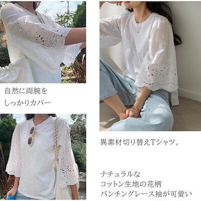 Tシャツ ブラウス レディース 30代 40代 50代 春トップス トップス プルオーバー 七分袖 ワイドシャツ 着回し 細身 ワイドレース袖Tシャツ 切り替え 可愛い