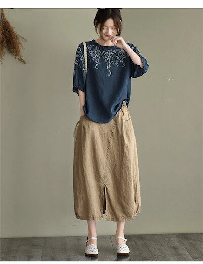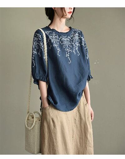 刺繍ブラウス トップス レディース リネン 半袖 花柄 フリル シャツ カジュアル 春 夏 花柄 刺繍プルオーバー ブラウス プルオーバー ゆったり 大きいサイズ 白 紺