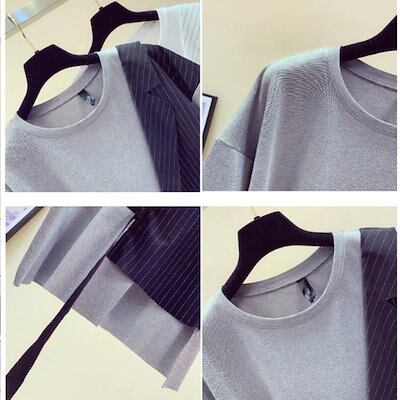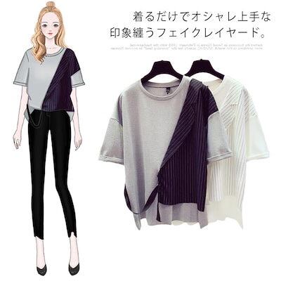 Tシャツ レディース 半袖 ゆったり 異素材 切り替え ストライプ ゆったり ラウンドネック トップス フェイクレイヤード 韓国ファッション お洒落