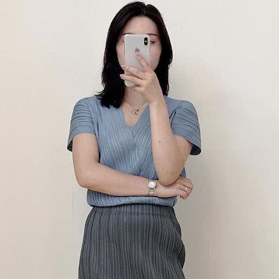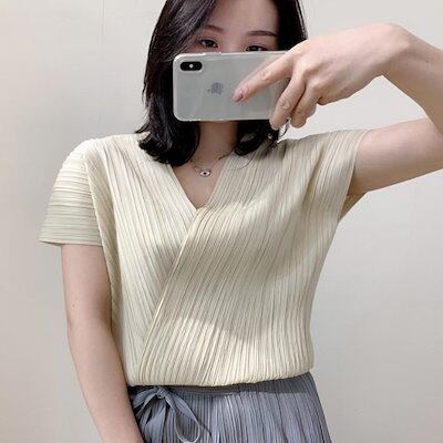 Tシャツ 無地 レディース 半袖 夏物 Vネック トップス プリーツ カットソー 無地 ゆったり 着痩せ プルオーバ- カジュアル シンプル キレイめ