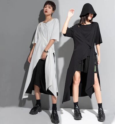 ヘムデザインTシャツ Tシャツ レディース 半袖 モード系 トップス カットソー ワンピース Tシャツワンピース 前後差 レイヤード風 アシメ 裾変形 無地 個性的 ユニセックス 大人 カジュアル ゆ