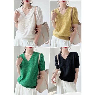 サマーニット ニットソー レディース シャツ 無地 春 夏 ニット トップス ブラウス Tシャツ シャツブラウス 体型カバー 半袖 ニットカットソー