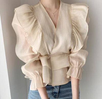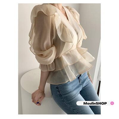 春夏 新作 フレア Vネック ゆったり 五分袖 ブラウス トップス きれいめ シフォン 韓国風 おしゃれ カジュアル オフィス 通勤 着痩せ