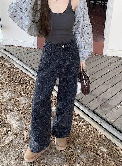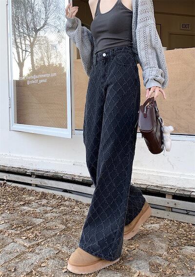 2024 春夏パンツ デニム ジーンズ モップパンツ ジャガード 菱形 ワイド ストレート ハイウエスト 脚長効果 美脚効果 細見え 春 黒 ブラック カジュアル 韓国ファッション レディース お出か