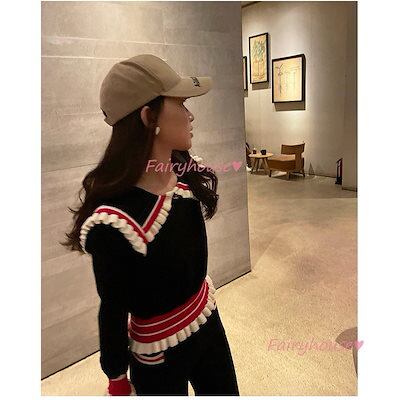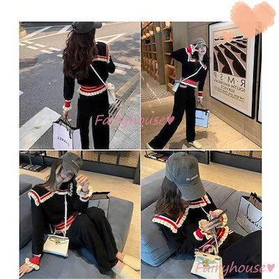ニットセットアップ レディース 春秋冬新作 ニット上下セット 長袖セーター 配色 ワイドパンツニットセットアップ オシャレ 部屋着 カジュアル ゆったり