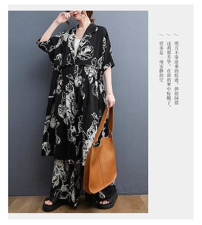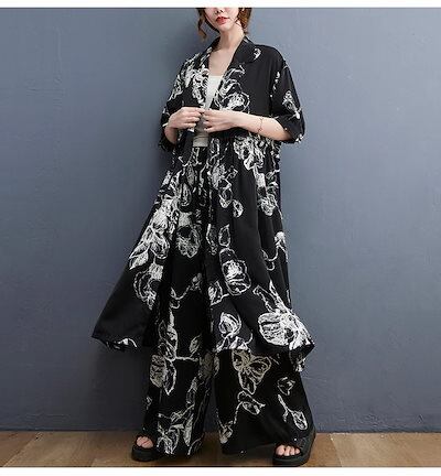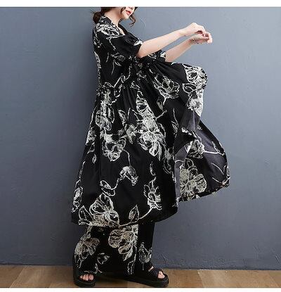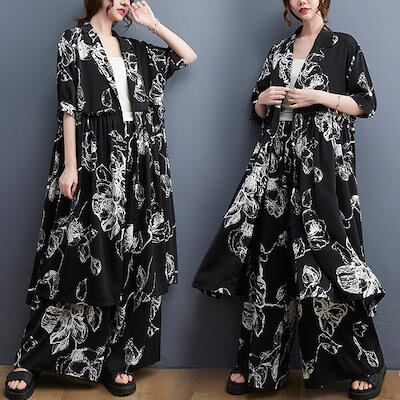 「ファットガール」花柄セットアップ 上下セット レディース スーツセット ロングブラウス+ワイドパンツ ゆったり 体型カバー お尻すぽっり ママスーツ 中年 30代/40代 メガ割