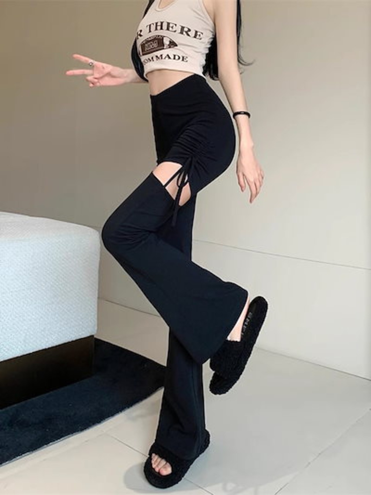 2024 秋冬 パンツ モップパンツ ロングパンツ ワイド ハイウエスト 脚長効果 美脚効果 細身 細見え 夏春 カジュアルフィット かわいい 韓国系ファッションサイド 加工レディース お出かけ