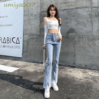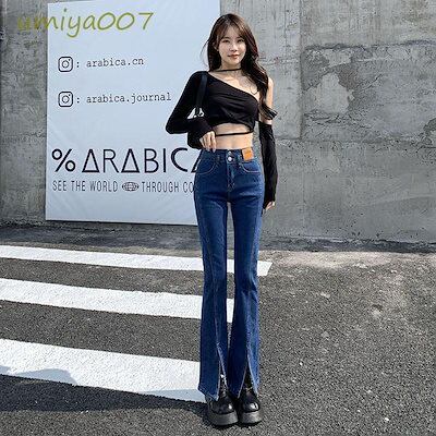 デニムパンツ レディース フレアパンツ ロングパンツ ハイウエスト 美脚 脚長 韓国 スリム デイリーコーデ カジュアル ジーンズ おしゃれ