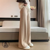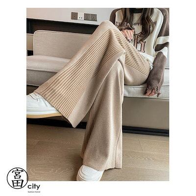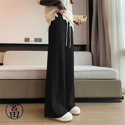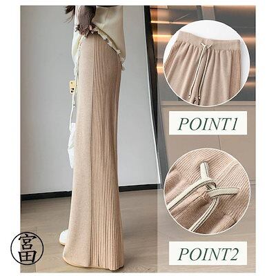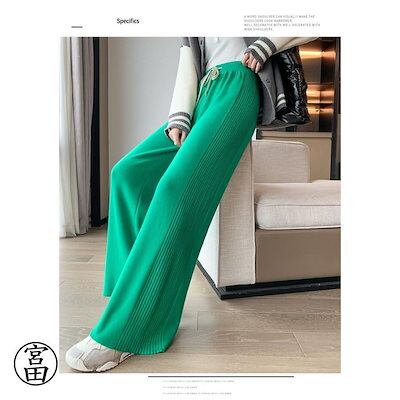 冬の暖かさ!ワイドパンツ 秋冬 ガウチョパンツ パンツ レディース ロングパンツ フレアパンツ ニット パンツ ニットパンツ ロング丈 秋物 ウェストゴム 体型カバー リボン付