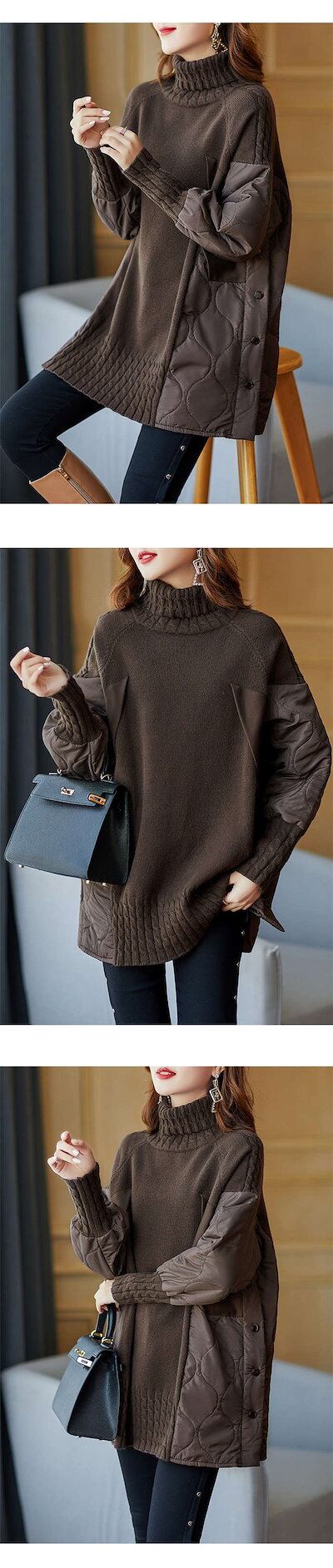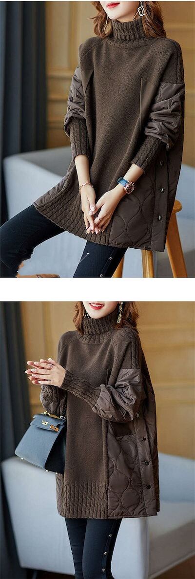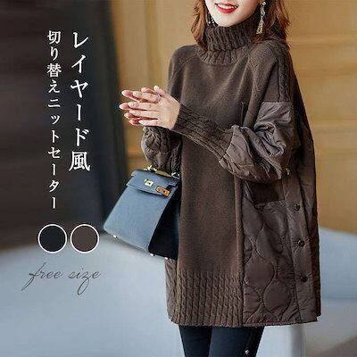 ニット レディース トップス リブニット 秋冬 長袖 厚手 レイヤード 切り替え 体型カバー セーター チュニック ドッキングニット ハイネック ゆったり 大きいサイズ ビッグシルエット ニットウェア