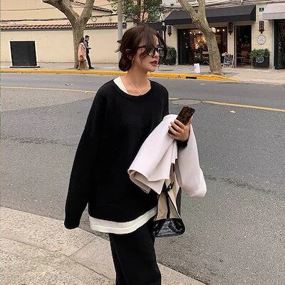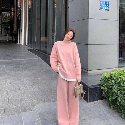 2024秋冬服レディースニットセーター上下二点セットアップ韓国ファッション長袖トップスワイドパンツロング肌にやさしいカジュアル 涼しく楽ちんセットアップ