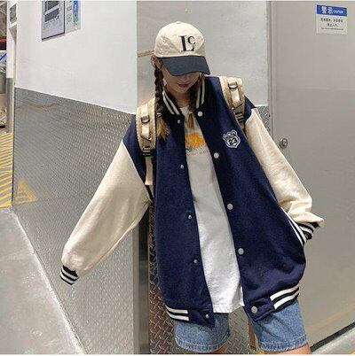 スタジャンスタジアムジャンパージャケットブルゾンバイカラーワッペンスナップボタンレディースメンズカジュアルアメカジかわいいスポーティーゆったり大きいサイズ体型カバー秋冬オーバーサイズアウター羽織上着韓